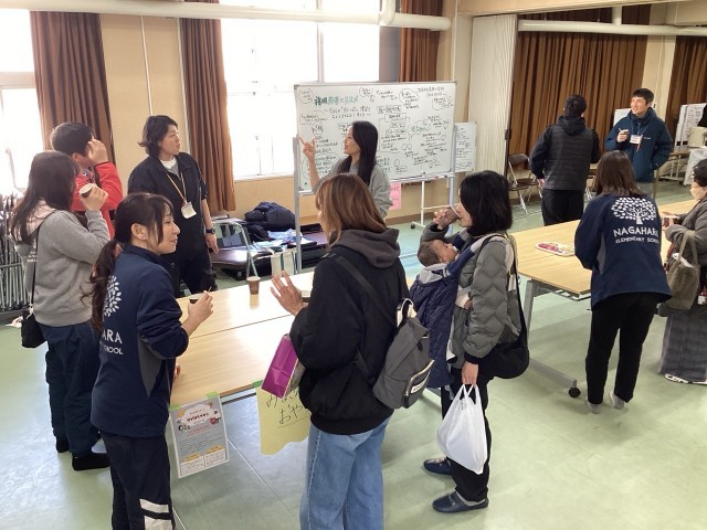今回の学級懇談会はワイド版として、毎月行っていた長原サロンを拡大し、学年を超えたつながりやふれあいを求めて多目的室で学習参観後行われました。