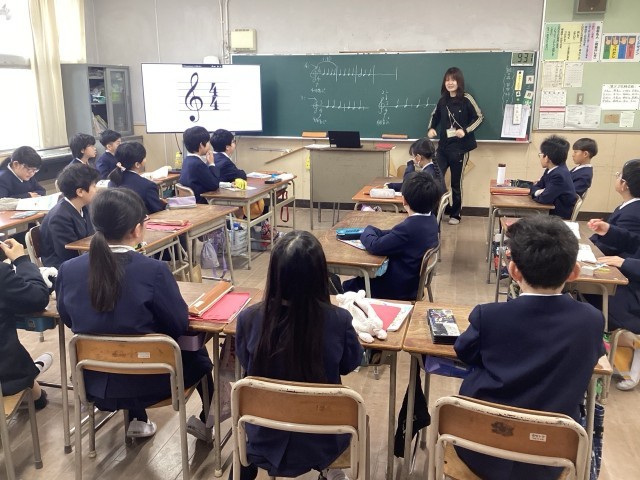 リズムを取りながらその音符について体感をする子どもたち。みんなの穏やかさが教室に広がり、なんだかほっこりする空間でした。