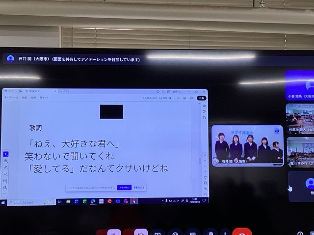 改めて歌詞だけ聞くと何の曲だったかと戸惑うこともありましたが、各教室であーでもない!こうでもない!と話し合う姿が見られ、子どもたちも楽しむことができました。
