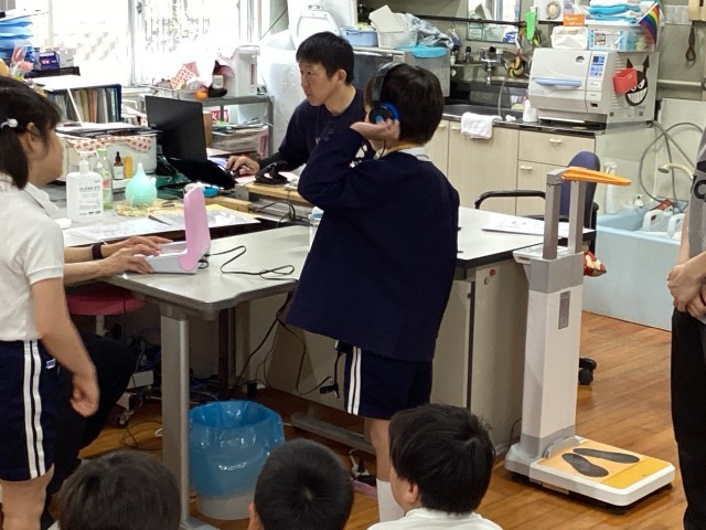 保健室の先生の説明をしっかりと聞き、ヘッドホンを装着して検査に臨みました。