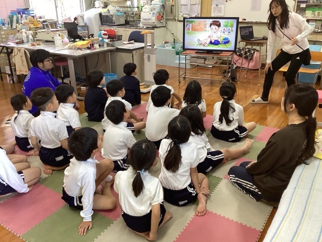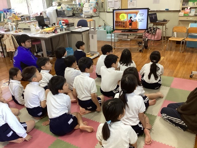 モニターに映るイラストを見ながら、「くつをそろえるんだよね」など、一つひとつのマナーを思い出した2年生。
