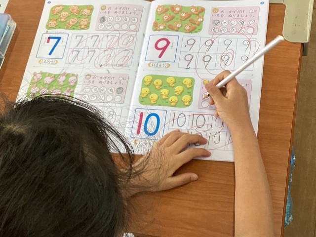 今日はドリルを使って、一文字ずつ丁寧に数字を書く練習をしました。