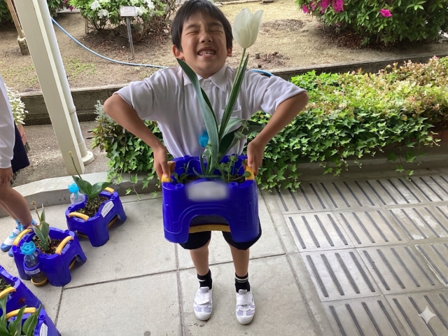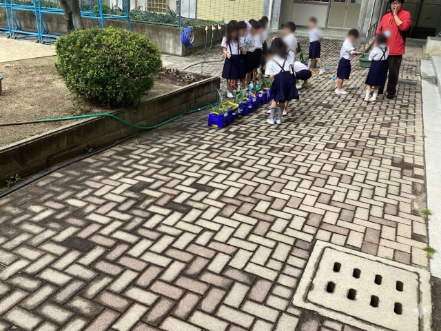 「新1年生のために」という一つの目標に向かって、友だちと協力して重い鉢を運んだ2年生。