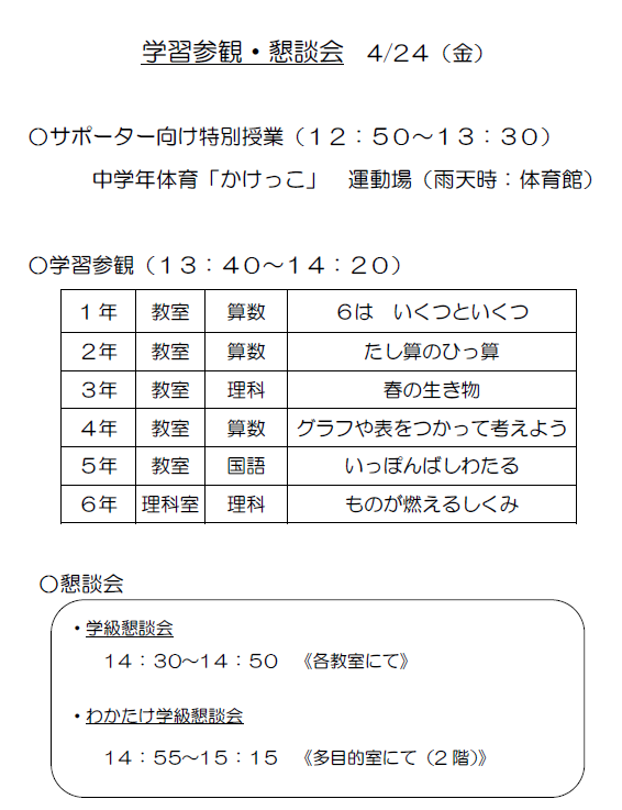 明日4月24日(金)は学習参観・懇談会です。