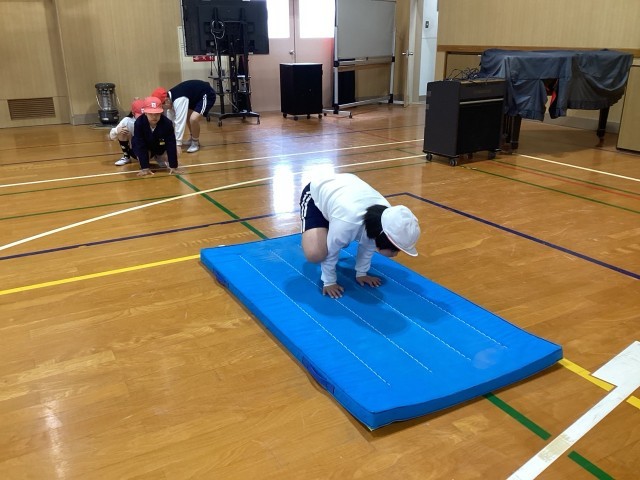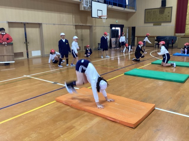 今日は少し寒さも和らぎ、体育館では子どもたちがマット運動を学んでいます。