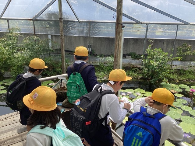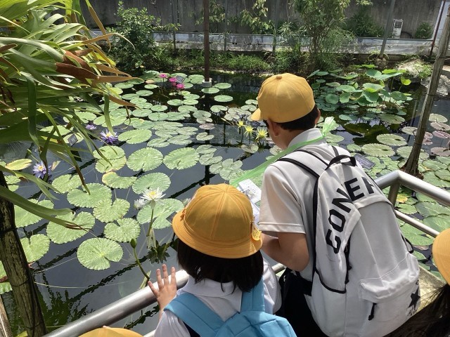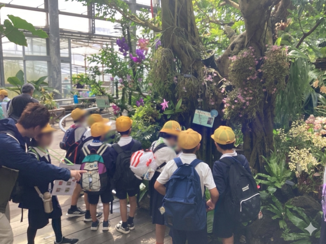 遠足のメインスポット「咲くやこの花館」に到着!ここでは3・4・5年生が混ざった「縦割り班」で行動しました。「あっちに大きなサボテンがあるよ!」「この花、不思議な形だね」と、ワークシートを手に珍しい植物を熱心に調べて回る子どもたち。上の学年が下の学年のペースに合わせ、「次は何を見ようか?」と優しく相談しながら進む姿が、館内のあちこちで見られ、とても微笑ましい光景でした。