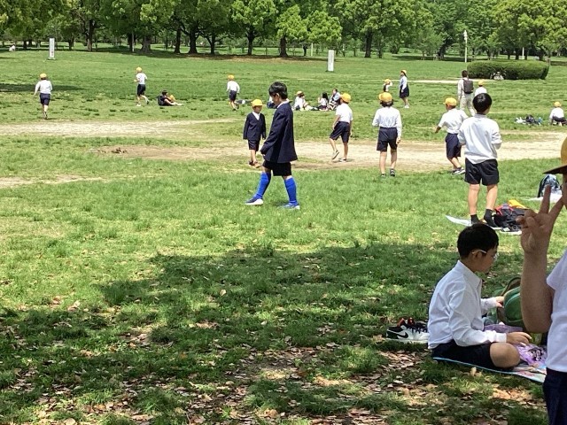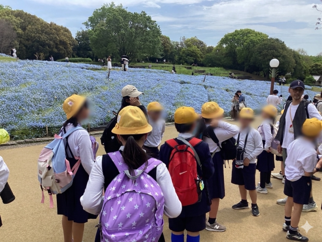 自由時間には、広い公園を活かして「宝物探し」に熱中する子もいました。「見て見て!すごいよ!」と駆け寄ってきた子の手には…なんと、きれいなおむすびの形をした石が!自然が作った奇跡の形に、周りのみんなも「本当だ!」「美味しそう!」と大興奮。自分だけの特別な宝物が見つかって、とっても嬉しそうでした。遠足の締めくくりには、太陽の光を浴びてキラキラ輝く満開の花畑の前で、クラスごとに記念撮影。自然の不思議に触れ、美しい景色に癒やされ、心もお腹も大満足の一日になりました。