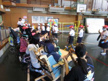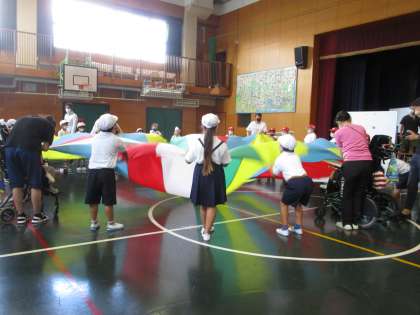 次に、「ボール運びリレー」をしました。直接ボールに触れることができないので難しそうでしたが、みんなで協力して頑張っていました。最後に「パラバルーン」をしました。バルーンが勢いよく上がったり下がったりする様子はとてもきれいでした。児童もとても楽しそうでした。帰るときは、支援学校の児童が見送ってくれました。とても楽しい活動になりました。次回もよろしくお願いします!