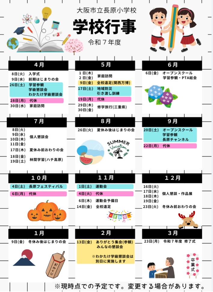 土曜授業の拡大や運動会土曜実施など、昨年度からの変更点もありますので、