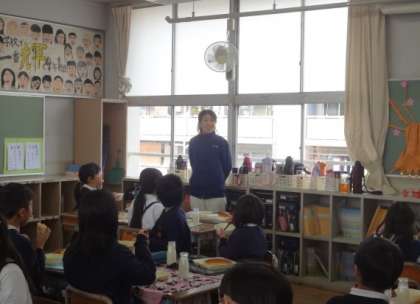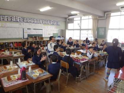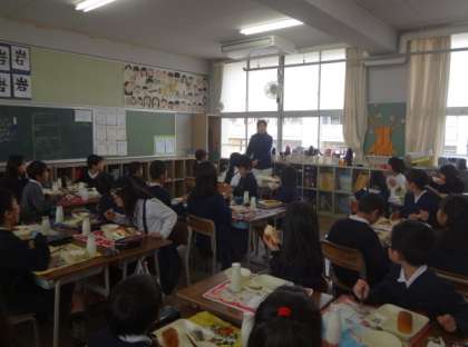 給食週間の四日目。今日は給食調理員の久田さんといっしょに4年1組の子どもたちが給食を食べました。「今日はみんなといっしょに給食を食べるのを楽しみにして来ました。栄養のバランスを考えて作っているので、できるだけ食べるようにしてくださいね。」との言葉に、子どもたちも「はい!」と答えていました。
