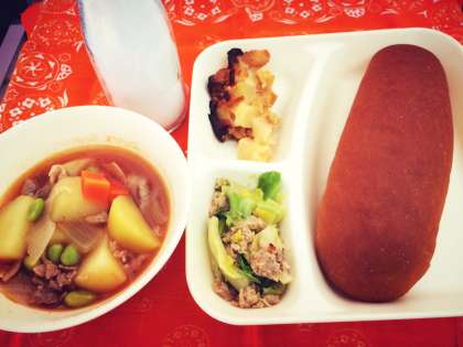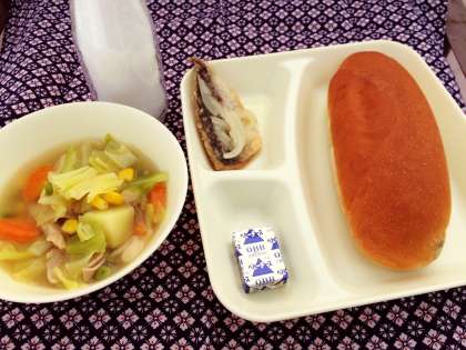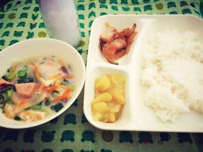 今日の給食のかす汁は、さけやこんにゃく、だいこん、青ねぎなどが入っています。