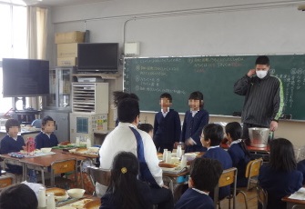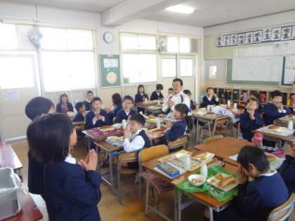 給食週間の最終日。今日は校長先生といっしょに3年1組の子どもたちが給食を食べました。最初は緊張気味の子どもたちも徐々に和らいできて、最後には“校長先生への質問コーナー”もあり、和気あいあいとした給食の時間となりました。