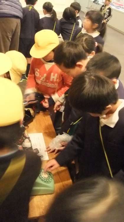 展示コーナーでは、“かや”の中に入ったり、洗濯板で洗濯したり、ダイヤル式の電話を回してみたりして、昔のくらしを体験しました。