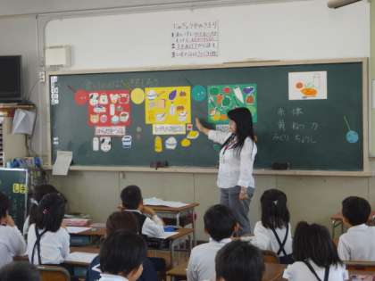 10月20日(火) 長吉出戸小学校の栄養教諭の田坂先生から、栄養についての学習がありました。テーマは「食べ物のはたらきについて知ろう。」2年生のみんなは、黒板に貼られた食べ物に興味を持ち、先生のお話をしっかりと聞いていました。
