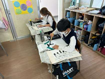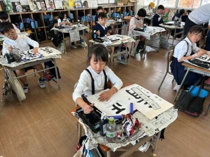 子どもたちが真剣な眼差しで、筆を動かしています。