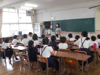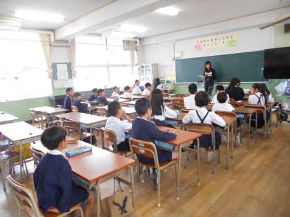 2年生が1年生を連れ、学校の特別教室を案内しました。