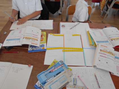 「たす数とたされる数を入れかえても答えは同じ」ということを、タイルを使いながら考えていました。