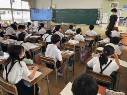 教室の大型モニターには、子どもたちの漢字ノートが映し出されていました。