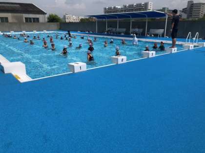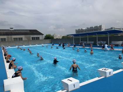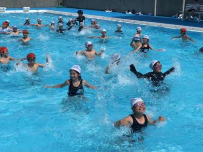 ムッとする暑さで体力を奪われそうな午後。子どもたちは水泳学習に汗を流しています。