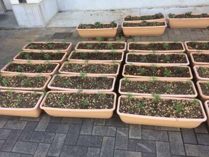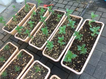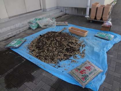 管理作業員さんが「腐葉土・赤玉の土・ボカシ肥料」などを混ぜてプランターに入れ、そこに大きくなってきた苗を植えていきました。明日は子どもたちがよく見える場所に移動します。