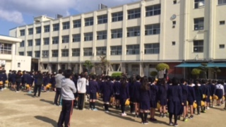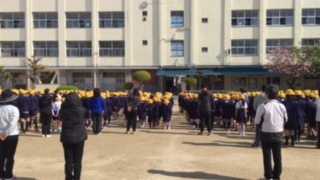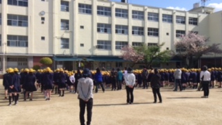 1年生も一緒に運動場に並びました。天気もよく、桜もまだキレイに咲いてくれていました。
