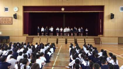 4年生以上の各学級代表、各委員会の委員長が、全校児童の前であいさつしました!