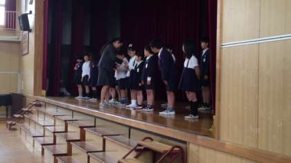 最後には校長先生から、代表の証(胸に付けるリボン)を受け取り、舞台を降りる姿は堂々としていました!