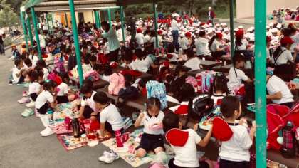 みんな午前の活動に歩き疲れて、お楽しみのお弁当。モリモリ食べています!