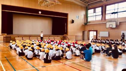 理科準備室から火災が発生した時の避難経路を確認し、雨天のため講堂へ避難しました。