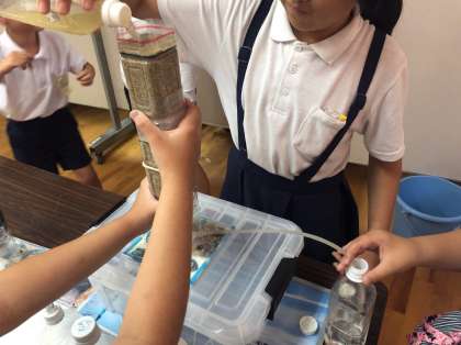 淀川で汲んできた、まだ泥の入っている水を濾過する実験をしました。実際に浄水場で使われている砂や活性炭を使って濾過を行い、泥水が透明な水になりました。