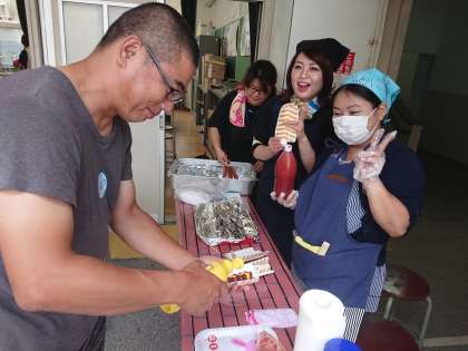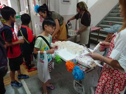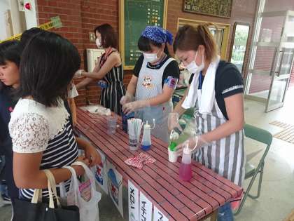 食べ物のお店があります。大人も受付にて購入して食べることができます。是非食べに来てください。上からそうめん、かき氷、フランクフルト。