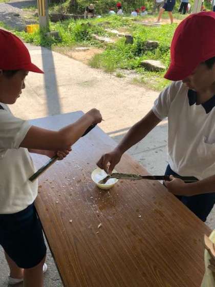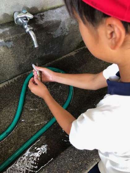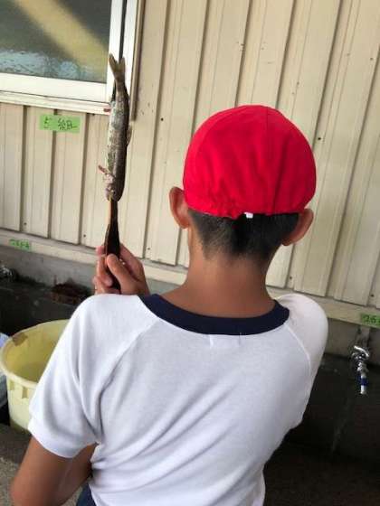 自分でつかんだ魚を水で洗い、串に刺したら塩を振って焼きます。