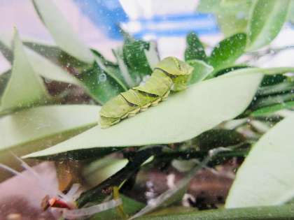 つい先日まで黒かった幼虫さんが、もう鮮やかな青虫さんに変身していました!