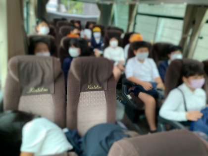 中型バスの車内では、アナと雪の女王をテレビで見ています。