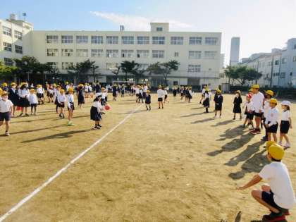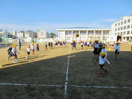 今日の児童集会は、たてわり班で仲良くドッジボールです。高学年は下投げでというハンデ付き。