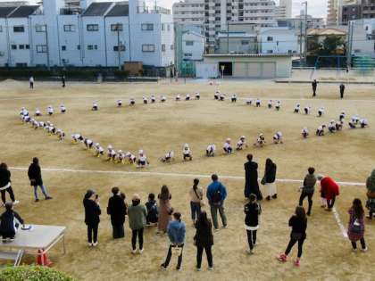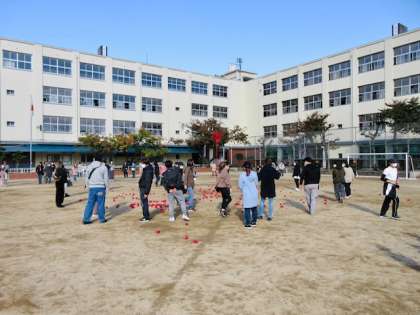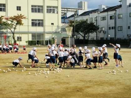 次は、玉入れ。子どもたち同士で対決した後は、お楽しみ。見に来てくれた方々に参加してもらって、子ども対大人対決。
