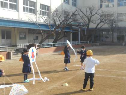 先週の図工で2時間かけてたこに絵をかき、その後1時間かけてたこに糸を括り付け、やっと今日、たこあげができるのです!