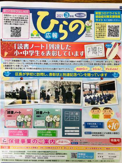 今回の一面には、現在、平野区長または副区長さんが平野区の各学校へ、学年の目標である読書量に到達した子どもたちを表彰してまわっているようすが掲載されています。