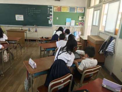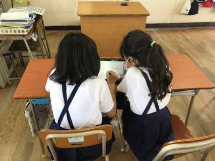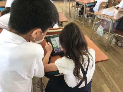 6月9日(水)、1年生の初めてのタブレット学習を6年生がサポートしました。