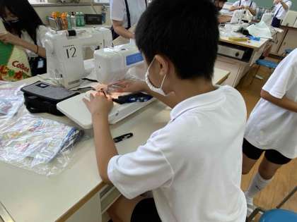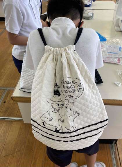 チャコペン、仮縫い、ミシン、ひも通しと色んな過程を経てやっと出来上がった子どもたちはとても嬉しそうです。