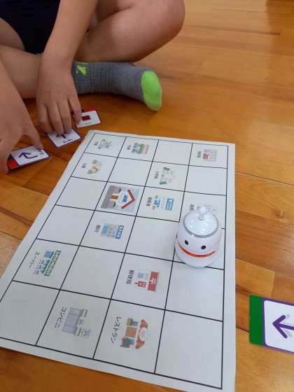 「すごい!考えた通りに動いた!」と喜びあう声がたくさん聞こえてきました。途中、時々ロボットの頭をなでて「がんばったね。えらかったよ。」と声をかけている子もいて、みんなほんわかした優しい気持ちになりました。