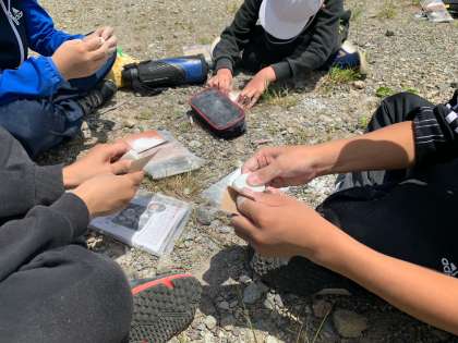 登山後はロッジの前にて勾玉(まがたま)作りをしています。3種類のサンドペーパーを使い上手に形取っており、職人さながらです。