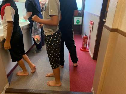 涼しい山中で眠気を覚ますためラジオ体操をしています。