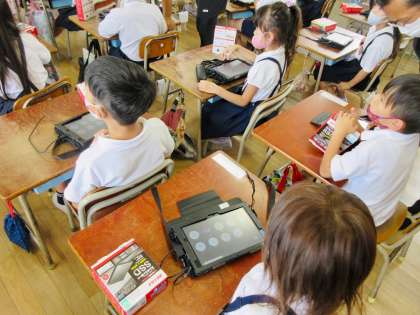 そのあと、一人ずつカメラやマイクの使ってテストしました。みんな同じ教室にいるにもかかわらず、友だちの顔が映ると、なんだか遠くにいる友だちに会えたかのような反応で嬉しそうでした。