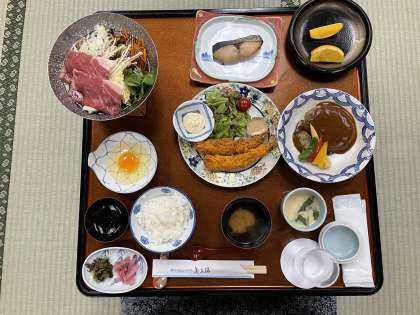 宿舎での夕食です。 みんな一方方向を向いて静かに食べています!