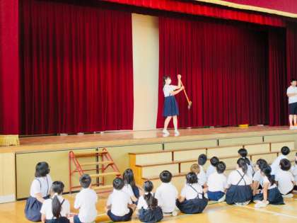 今日のゲームは講堂舞台のカーテンの隙間に通る物の名前を当てるクイズでした。