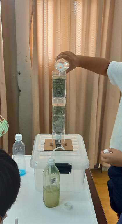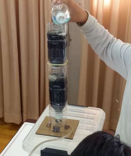 色や臭いのついた水が透明で臭いのない水になる、水のろ過実験をしました。砂を通った水と活性炭を通った水を比べました。色をつけた水が透明になってでてくると、「すごい!魔法みたい!」と歓声があがりました。