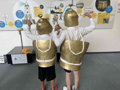 古墳の歴史の映像を見たあと、博物館の中に入り埴輪や石棺、火縄銃などを見ながらクイズをしました。そのあと土器や屏風などのパズルをしました。