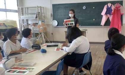 次は、それぞれの国のあいさつや国旗についてカードにまとめ、顔写真を撮りました。