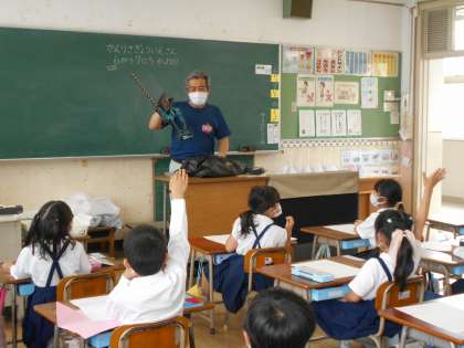 一昨日と今日、管理作業員さん、事務職員さんに教室に来ていただいて、お仕事について学習しました。管理作業員さんには実際に仕事で使う道具を見せていただき、事務職員さんには、紙や粘土など学校生活に必要な物を買っていることを教えていただきました。